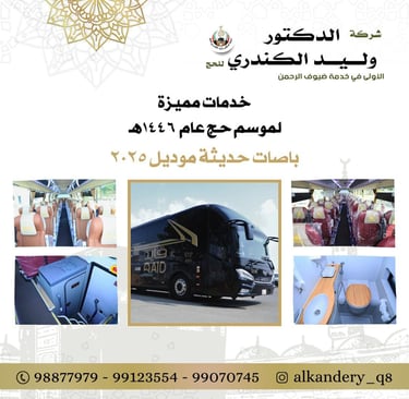 تُعتبر شركة الدكتور وليد الكندري الناقل الرسمي لحملة الحج على الخطوط الجوية الكويتية برحلة طيران خاص لحجاج الحملة، وهي شراكة تعكس التزام الشركة بتوفير خدمات متكاملة وموثوقة للحجاج. من خلال هذه الحملة، تتمتع شركة الكندري بخبرة طويلة في تنظيم رحلات الحج، حيث تضمن توفير جميع التسهيلات اللازمة لضمان تجربة مريحة وآمنة للحجاج. يُمكن للحجاج الاعتماد على هذه الشراكة، التي توفر لهم وسائل النقل الحديثة والخدمات اللوجستية المتكاملة، مما يسهل عليهم أداء مناسكهم بطمأنينة ويسر. كما أن الخطوط الجوية الكويتية تُعرف بجودة خدماتها وكفاءتها العالية، مما يجعلها الخيار الأمثل لنقل الحجاج من وإلى الأراضي المقدسة. إن اختيار شركة الدكتور وليد الكندري كناقل رسمي يعكس ثقة كبيرة في قدرتها على تقديم خدمة متميزة تلبي احتياجات الحجاج وتضمن لهم رحلة روحية لا تُنسى.