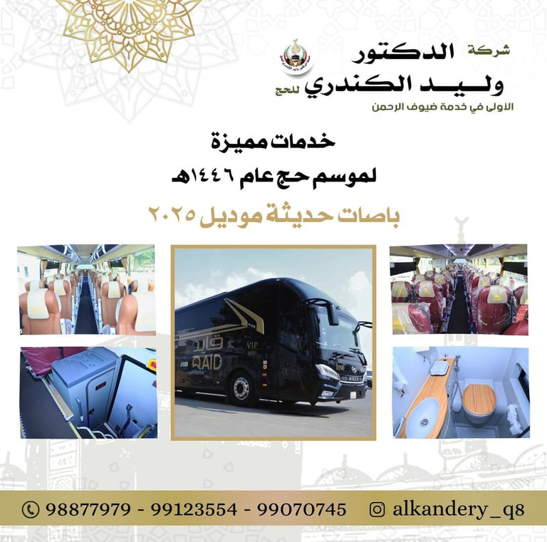 نقدم لكم باصات حديثة موديل 2025 مزودة بجميع وسائل الراحة، بما في ذلك دورة مياه ومقاعد واسعة لتوفير أقصى درجات الراحة لحجاجنا الكرام.