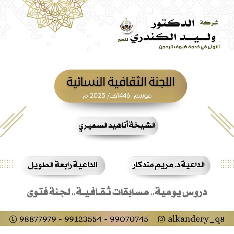 تعمل اللجنة الثقافية النسائية لحملة دكتور وليد الكندري للحج بجد لتعزيز الوعي الثقافي والديني بين النساء. تحت إشراف الشيخة أناهيد السميري، تسعى اللجنة إلى تقديم برامج وفعاليات متنوعة تشمل المحاضرات والورش التعليمية. تساهم الداعية دكتورة مريم مندكار بخبرتها الواسعة في المجال الديني، حيث تقدم توجيهات قيمة حول مختلف القضايا. كما تضيف الداعية رابعة الطويل لمسة خاصة من خلال مشاركتها الفعالة في نشر الرسائل الإيجابية وتعزيز الروابط بين المشاركات. تهدف هذه الجهود إلى خلق مجتمع نسائي متماسك يساهم في خدمة الدين والمجتمع.